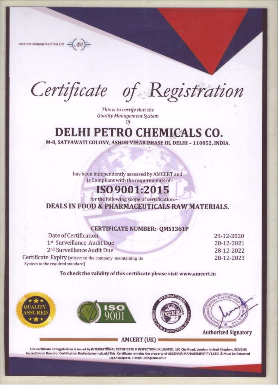 Delhi Petro Chemicals Co. is an ISO Certified company ISO 9001:2015 & FSSAI licensed company 13322001000315, helmed by Ashok & Akshay Kumar, has been the best in industry supplier of food-grade chemicals and for over four decades. Based in Delhi, our products include a range of pharmaceutical, bakery, and confectionery industries. We have created a presence in India with our sustainable delivery practices and provided products with the highest quality, using ethical sourcing practices. Being for 44 years in the industry, we have ensured trading the finest quality confectionary and pharmaceutical ingredients for superior end products. With the presence at 5 locations in Delhi, we have always been easy on procurement, hence have helped to achieve minimum transportation cost. We have always cultivated a culture of trust and integrity at our workplace, which has helped us develop long-term relationships with numerous clients. Keeping up with evolving times and regular feedback from our patrons has helped us build a name in the market.